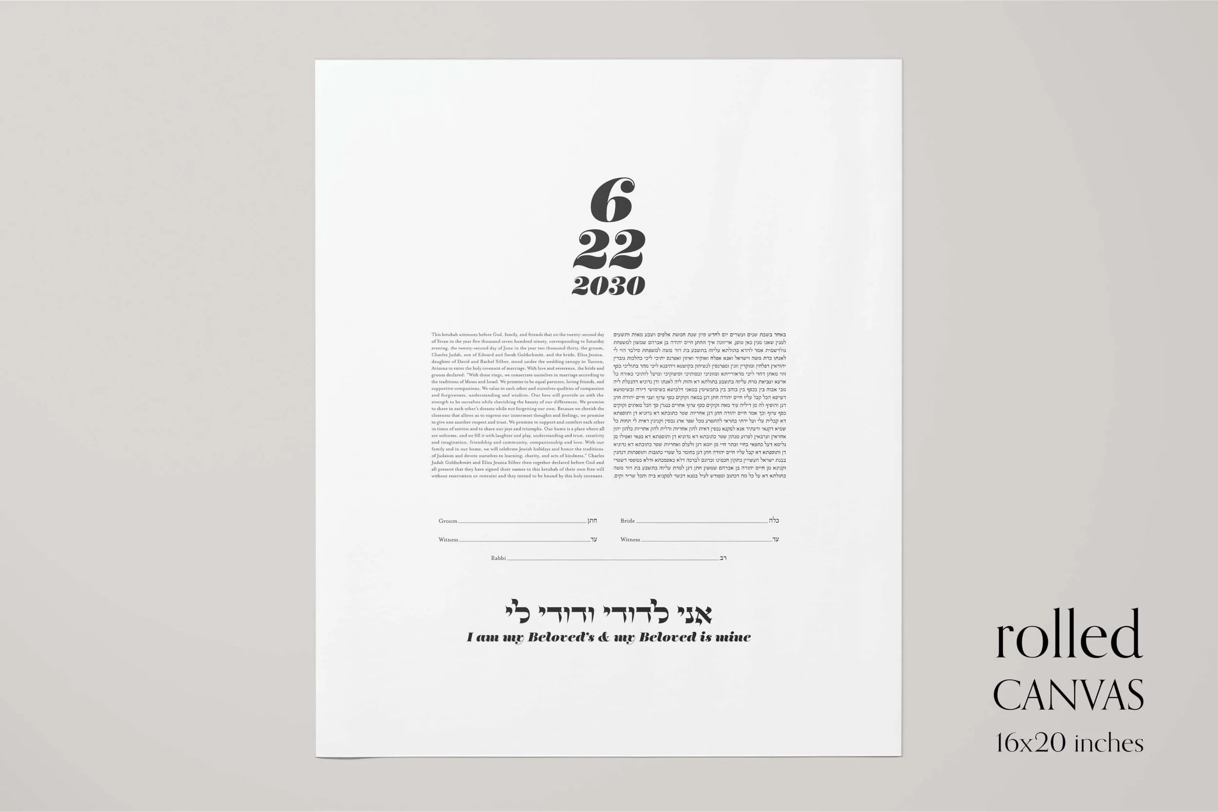 Your wedding date is the star of this ketubah. Simple and elegant text for a bold, well-designed ketubah will keep this design fresh even 50 years from now.